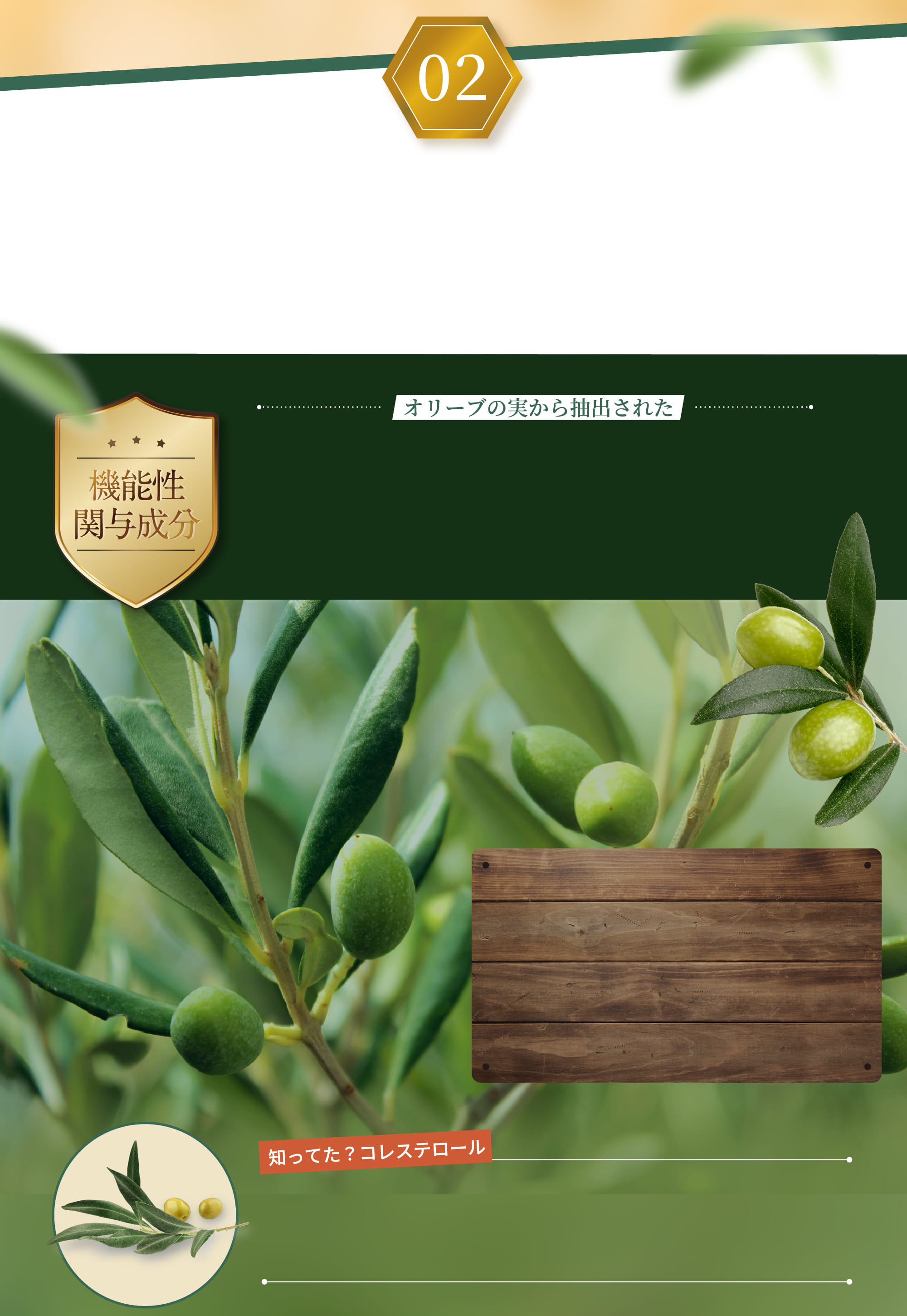 オリーブオイルなどで親しまれ、人々の食事と健康を支えてきたオリーブ。オリーブの実から抽出されたヒドロキシチロソールと呼ばれる機能性関与成分が含まれています。続けることで、LDLコレステロールの酸化を抑制する働きが期待されています。
