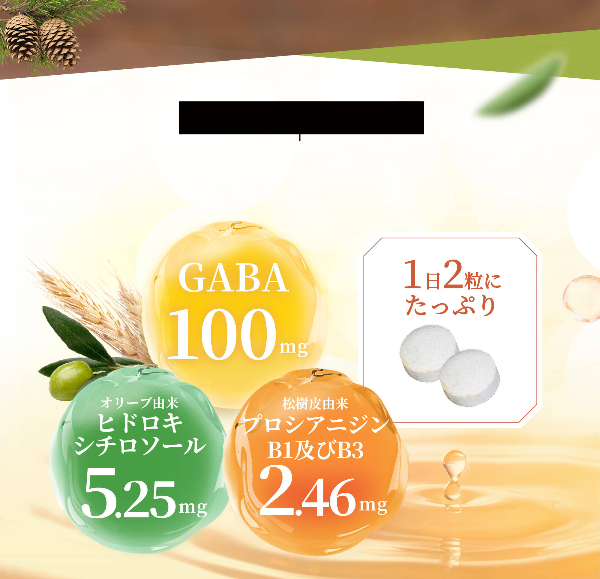 本品には、オリーブ由来ヒドロキシチロソール、GABA、松樹皮由来プロシアニジンB1及びB3が含まれます。
