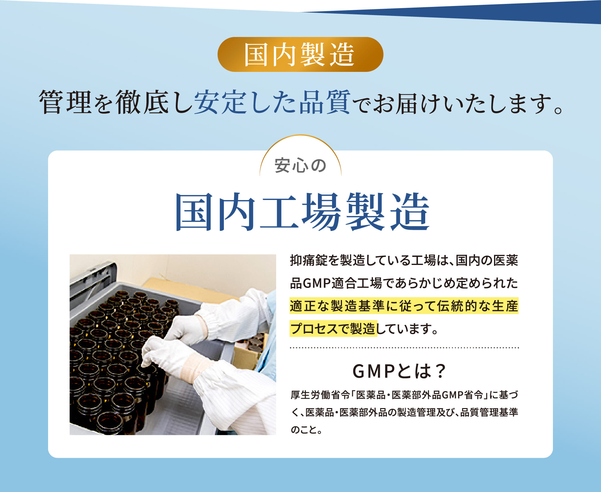 抑痛錠を製造している工場は、国内の医薬品GMP適合工場であらかじめ定められた適正な製造基準に従って伝統的な生産プロセスで製造しています。