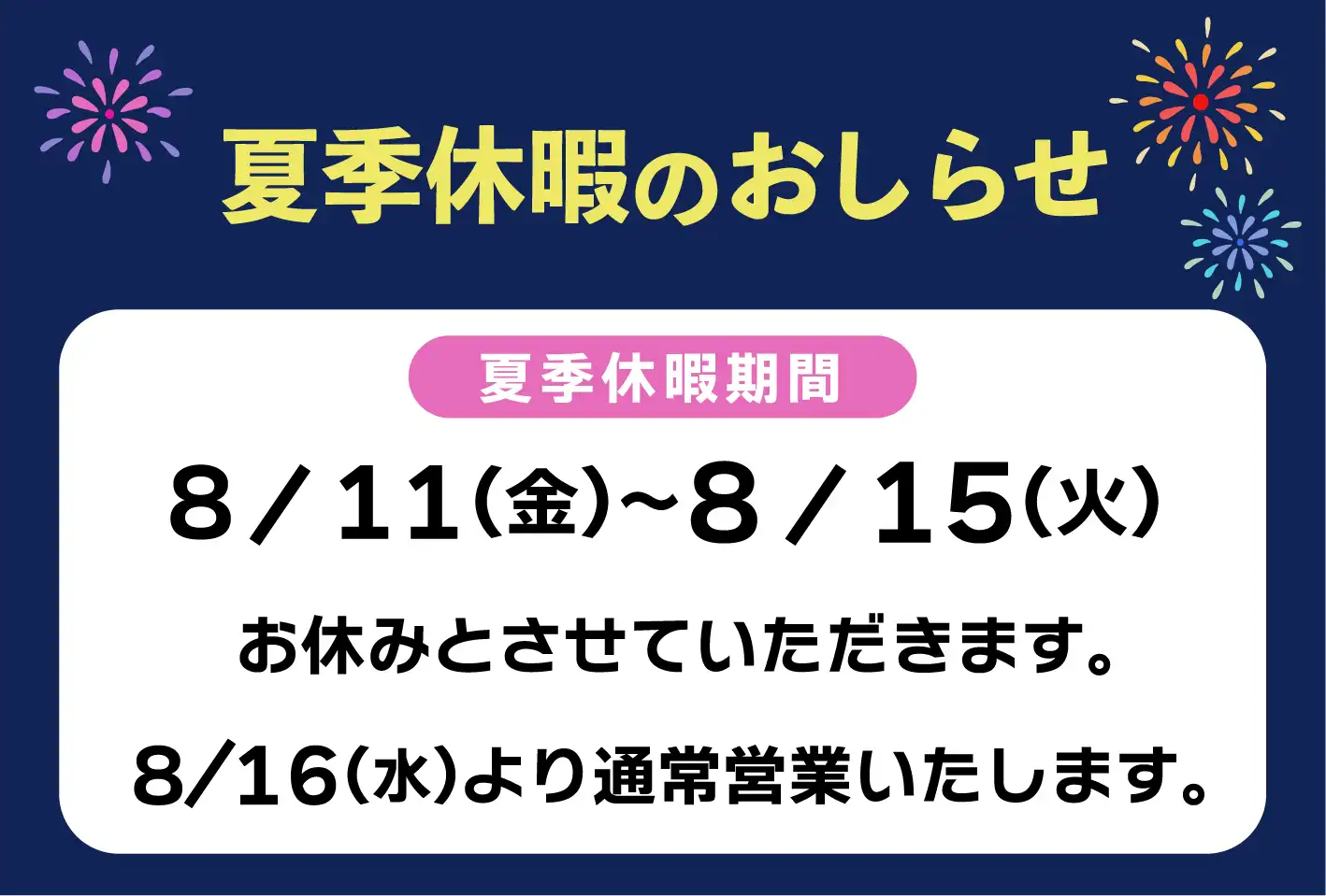 連休期間中に頂きましたお問い合わせにつきまして8月16日(月)より順次対応となります。
