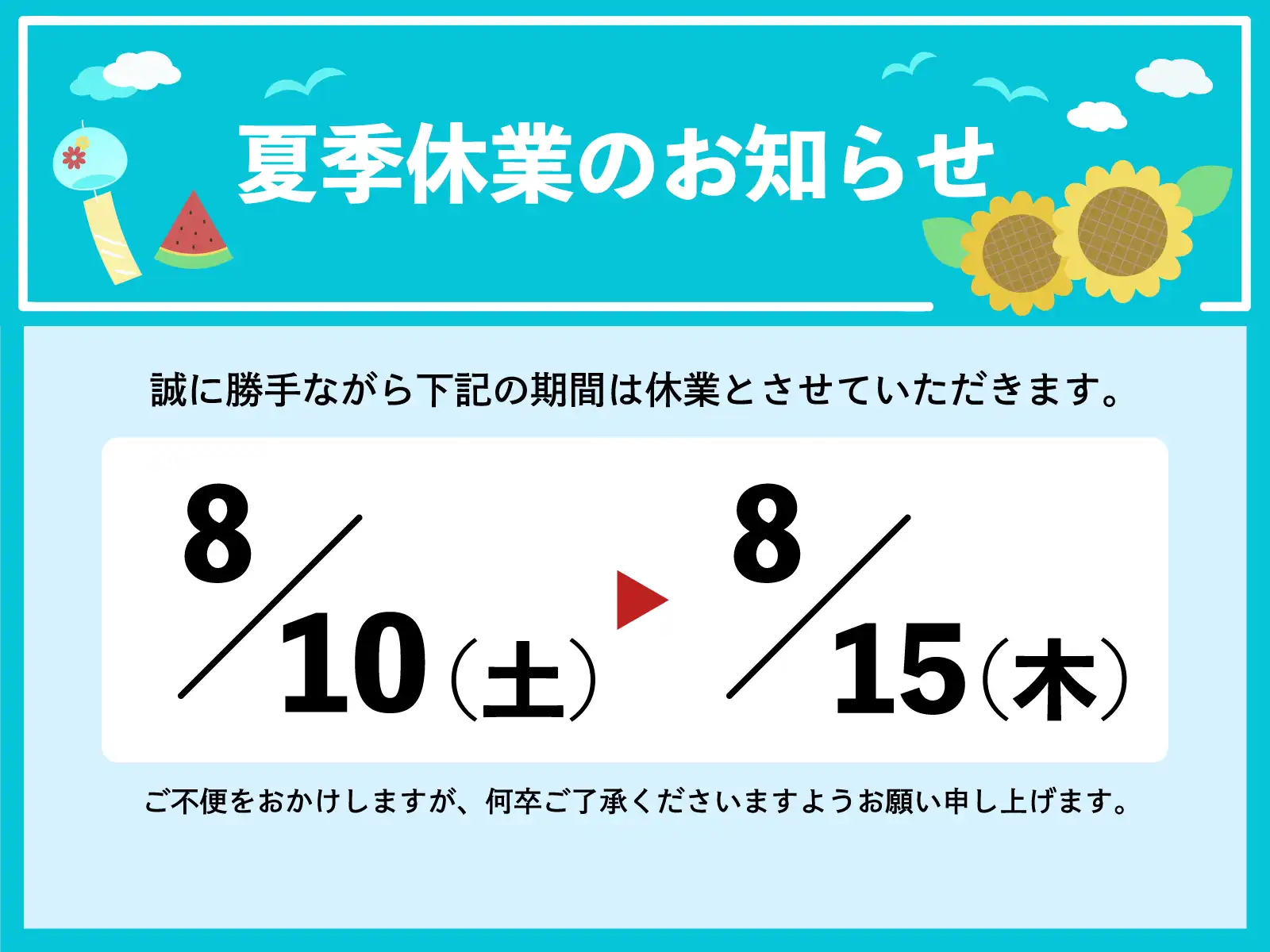 本年の夏季休業は以下の日程となっておりますので、