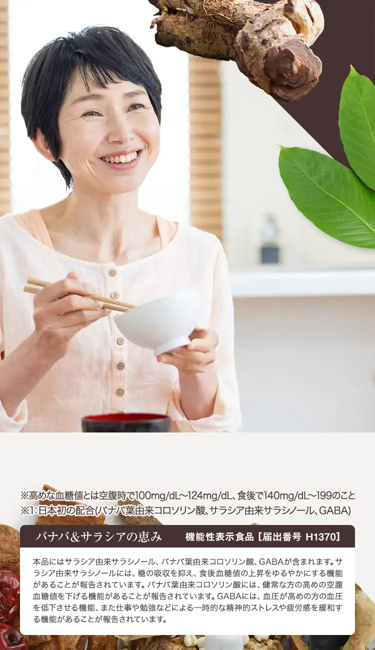 本品にはサラシア由来サラシノール、バナバ葉由来コロソリン酸、GABAが含まれています。