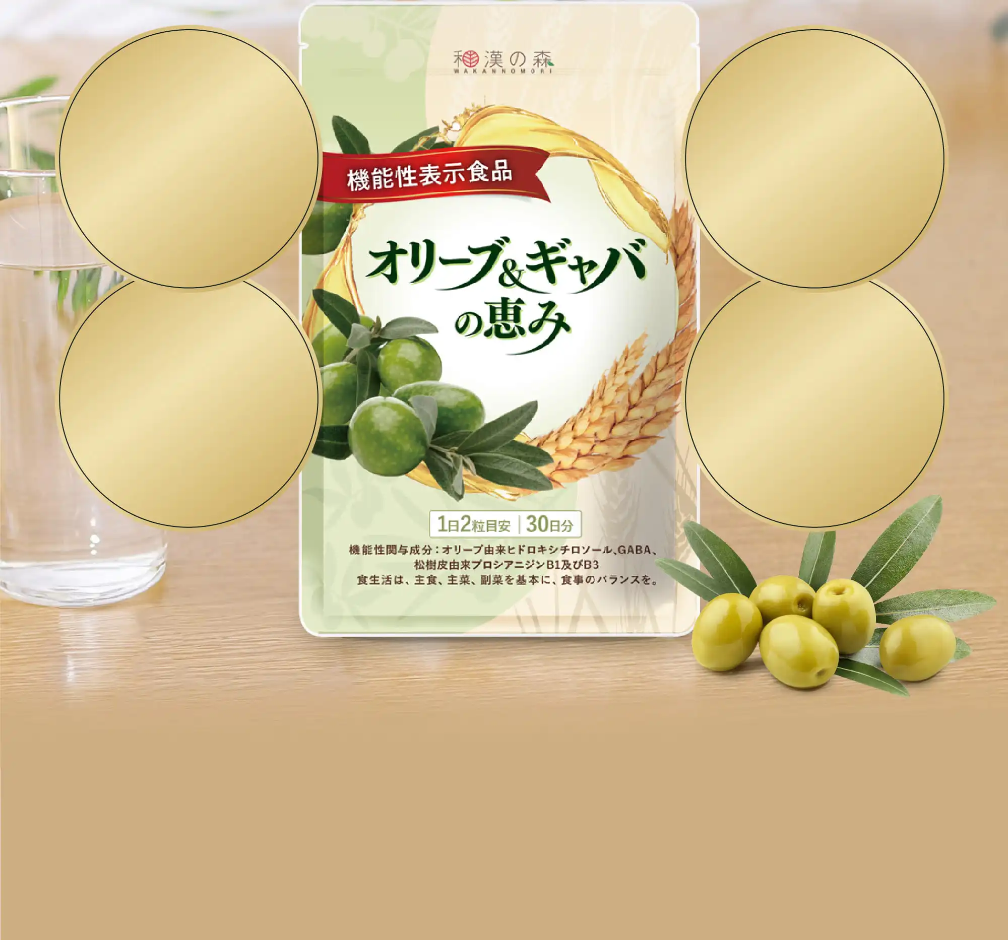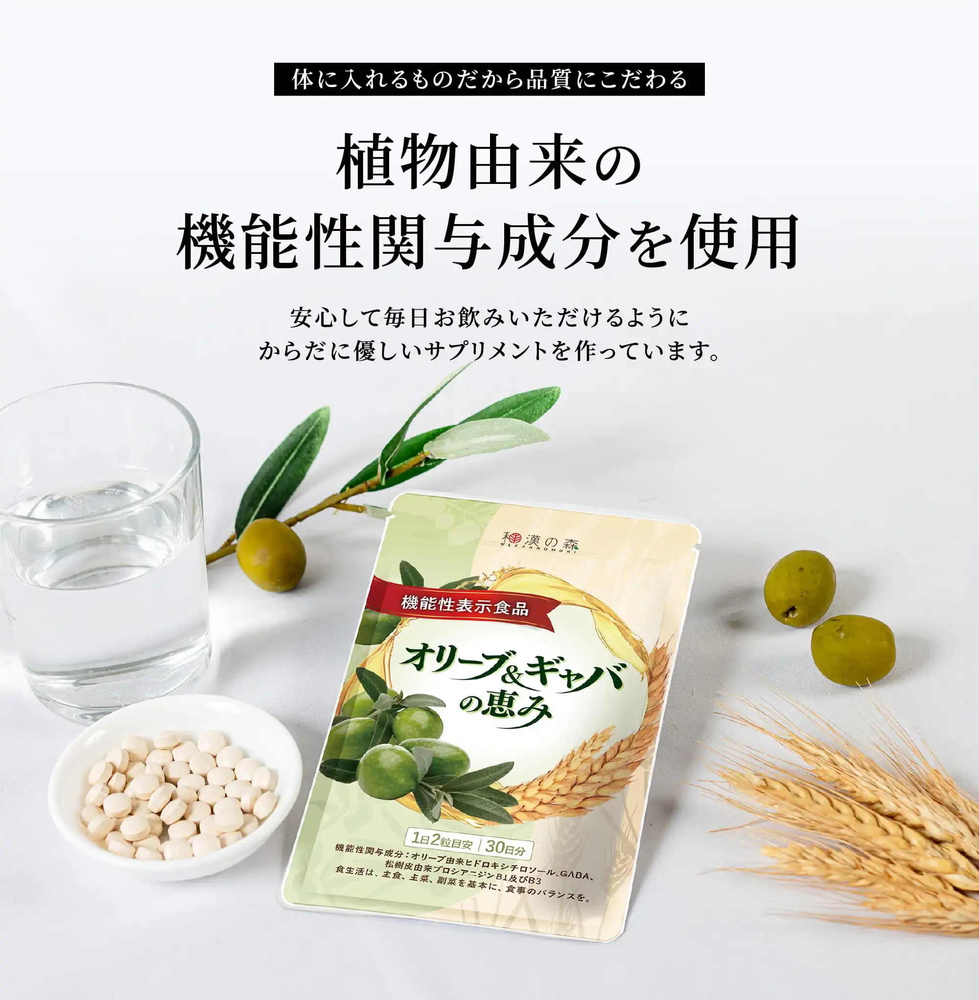 オリーブ由来ヒドロキシチロソールには、抗酸化作用により、血中のLDLコレステロールの酸化を抑制させることが報告されています。GABAには、血圧が高めの方の血圧を低下させる機能、睡眠の質(眠りの深さ)の向上に役立つ機能、すっきりとした目覚めをサポートする機能、仕事や勉強などによる一時的な心理的ストレスや疲労感を緩和する機能、日常生活で生じる一時的な活気・活力感の低下を軽減する機能、肌の乾燥が気になる方の肌の弾力を維持し、肌の健康を守るのを助ける機能があることが報告されています。松樹皮由来プロシアニジンB1及びB3には、悪玉(LDL)コレステロールや総コレステロールを下げる機能、加齢とともに低下する血管のしなやかさ(柔軟性)(血管を締め付けた後の血管の拡張度)の維持に役立つ機能、末梢血流を維持することにより、肌の弾力を維持し、肌の健康に役立つ機能、血管年齢が中高年に該当する方の血管のしなやかさ(柔軟性)(血管を締め付けた後の血管の拡張度)の維持に役立つ機能があることが報告されています。