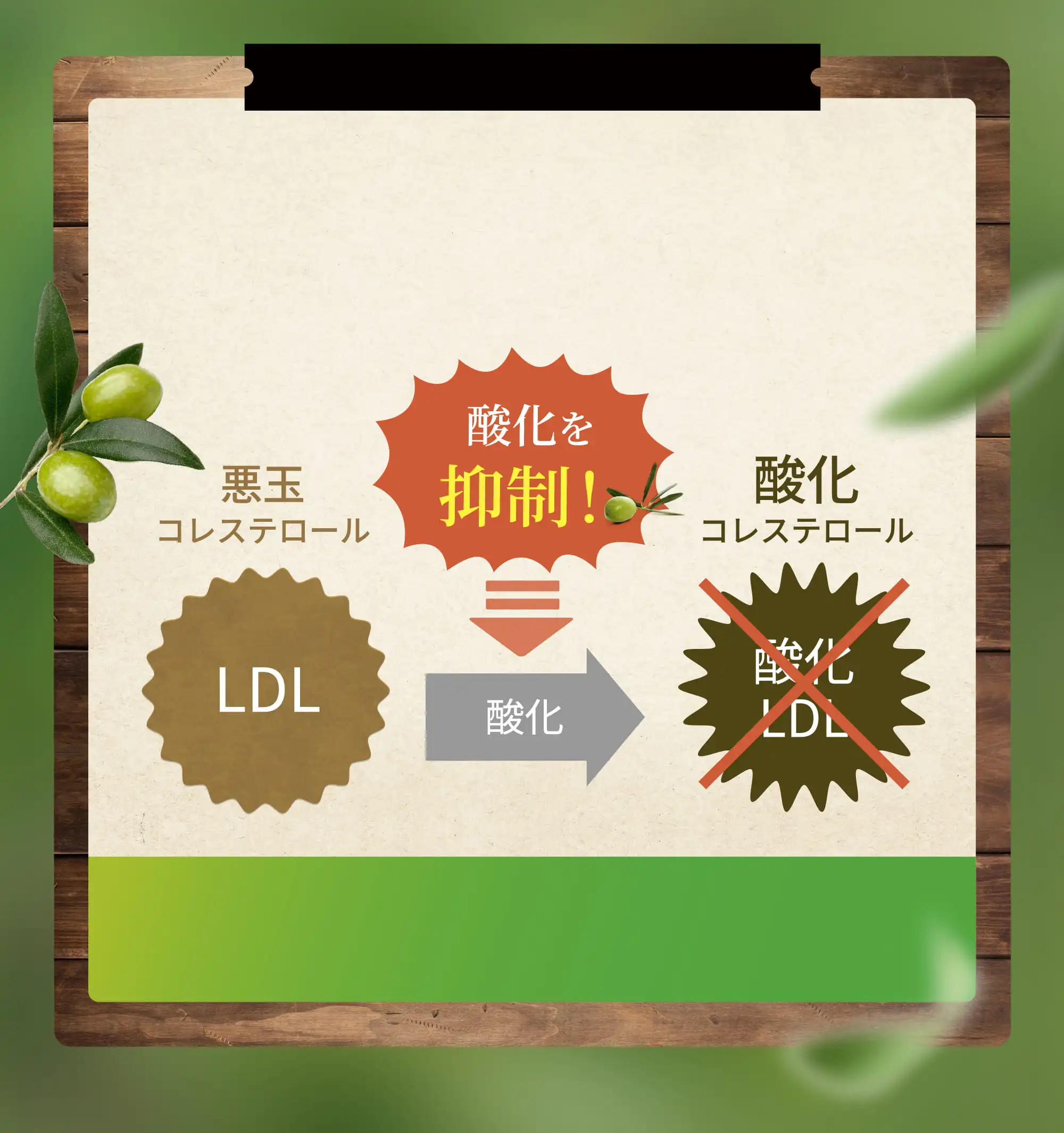 ※2 オリーブ由来ヒドロキシチロソールには、抗酸化作用により、血中のLDLコレステロールの酸化を抑制させることが報告されています。