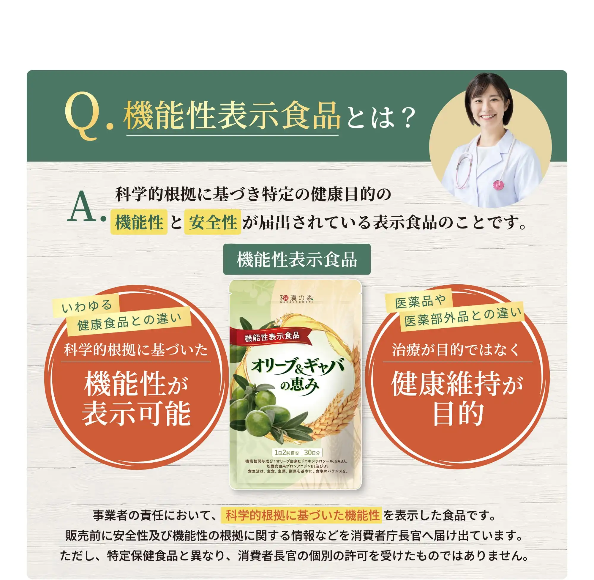 「本品は、事業者の責任において特定の保健の目的が期待できる旨を表示するものとして、消費者庁 長官に届出されたものです。ただし、特定保健用食品と異なり、消費者庁長官による個別審査を受け たものではありません。」