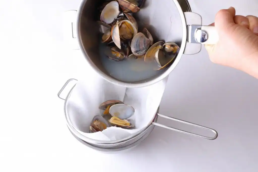 あさりに火を通しすぎない。あさりの汁を漉しておく。